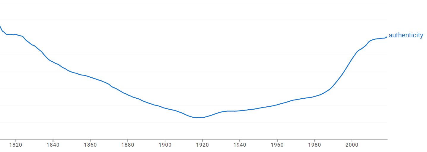 Authenticity didn’t always mean what it does today. Prior to the second half of the 20th century, authentic was mostly used to mean “factual”. A common book title from the 1800s might be “The Authentic History of…” meaning a trustworthy, literal, or originally sourced document. It’s only in the last 50 years that authenticity has come to be a character trait, something people could possess. That’s a pretty neat trajectory for a word, and I think most of us find authenticity a pretty meaningful descriptor.